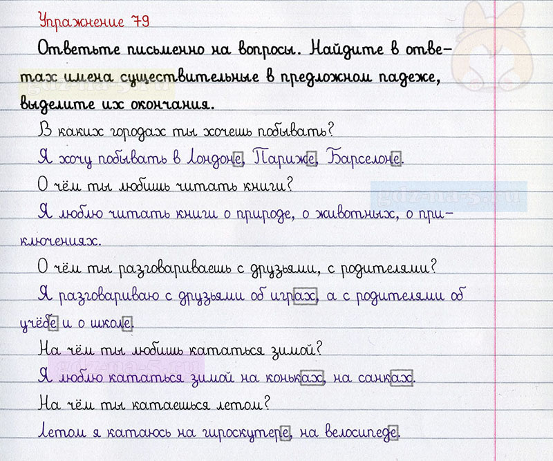 Подробные ответы к 79 упражнению 2 части рабочей тетради по русскому языку авторов Л. Ф. Климановой, Т. В. Бабушкиной для учащихся 3 класса.