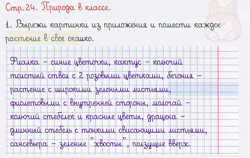 Подробные ответы к заданиям, расположенным на 24 странице 1 части рабочей тетради по окружающему миру авторов Плешаков А.А., Новицкая М.Ю. для учащихся 1 класса.