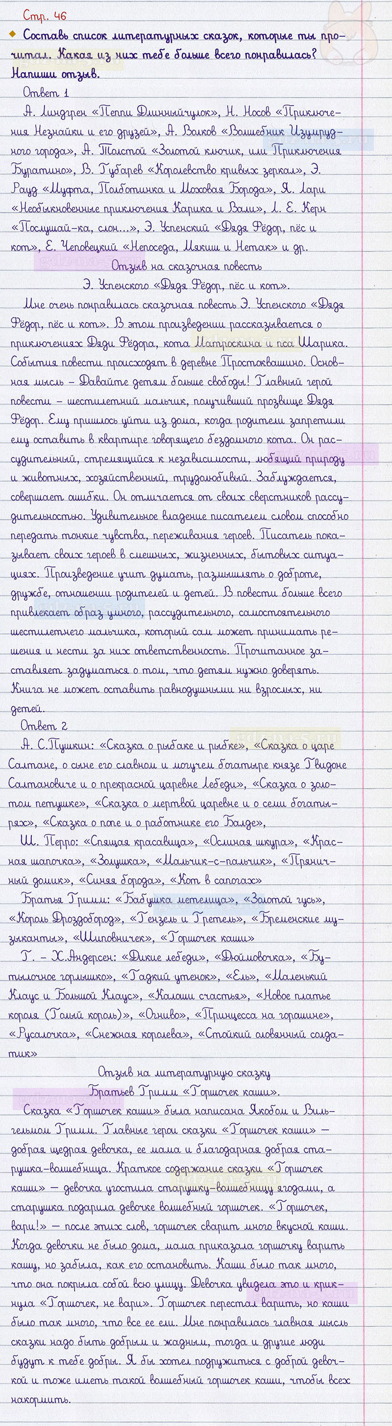 Подробные ответы к вопросам и заданиям, расположенным на 46 странице рабочей тетради по литературному чтению авторов М.В. Бойкина, Л.А. Виноградская для учащихся 3 класса.