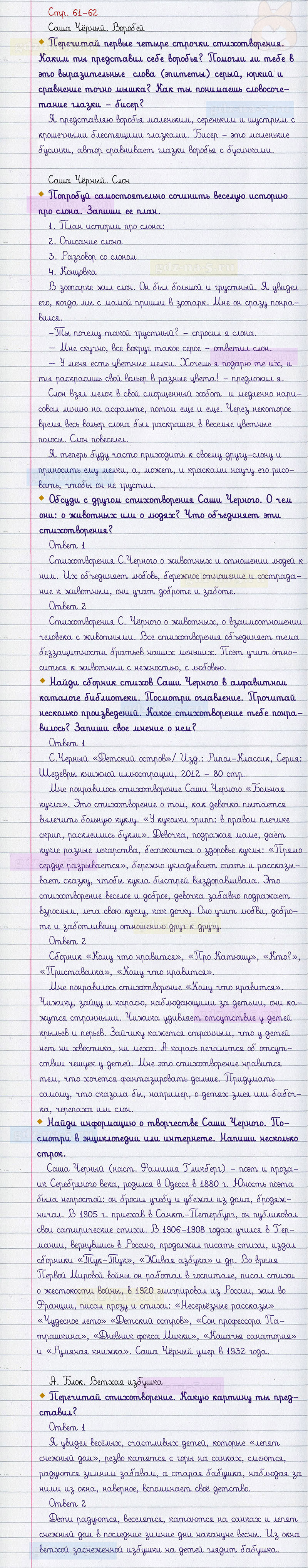 Подробные ответы к вопросам и заданиям, расположенным на 61-62 странице рабочей тетради по литературному чтению авторов М.В. Бойкина, Л.А. Виноградская для учащихся 3 класса.