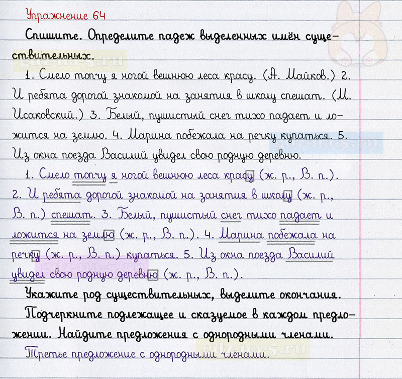 Подробные ответы к 64 упражнению 2 части рабочей тетради по русскому языку авторов Л. Ф. Климановой, Т. В. Бабушкиной для учащихся 3 класса.